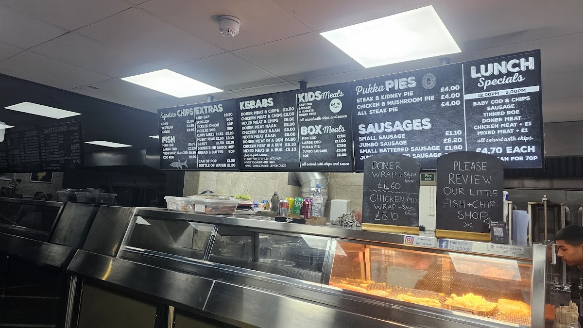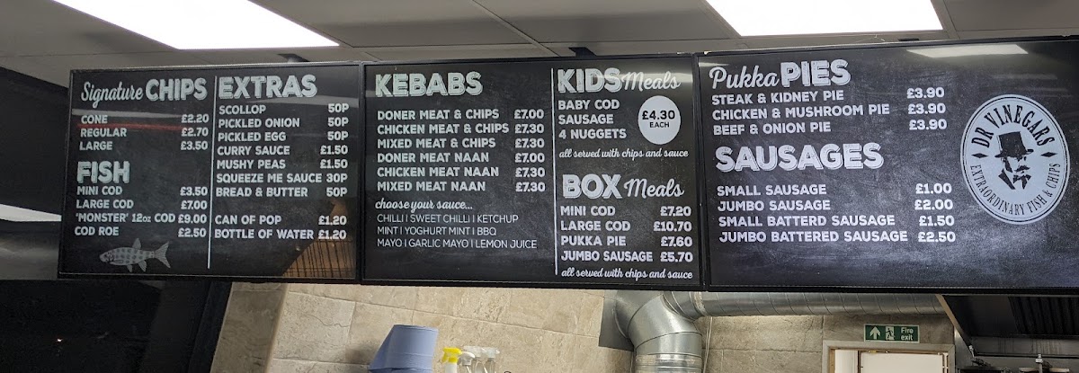 Dr Vinegar's Extraordinary Fish & Chips offers a diverse and hearty menu that caters to a variety of tastes. The Kebabs section features options like Doner Meat & Chips and Chicken Meat & Chips, complemented by Pickled Onion and Pickled Egg. For a twist, you can add a Curry Sauce for extra flavor. Families will appreciate the Kids Meals, which include 4 Nuggets and Doner Meat, perfect for younger appetites. The Pukka Pies selection is a classic favorite, offering Steak & Kidney Pie, Chicken & Mushroom Pie, and All Steak Pie for a satisfying meal. If you're craving fish, choose from the Box Meals, such as Mini Cod and Large Cod, or opt for a quick bite with a Can of Pop or Bottle of Water to wash it down. For those in the mood for something savory, the Sausages section features Small Sausage and Jumbo Sausage. Add a little extra with Scollop, Pickled Onion, Pickled Egg, Curry Sauce, or Mushy Peas. Finally, for something a little different, try the Chip Bap, or enjoy Cod Roe, Baby Cod, or even a Sausage on its own. Whether you're in the mood for a comforting pie, crispy fish, or a hearty kebab, there's something for everyone on Dr Vinegar’s menu, making it an exceptional choice for both quick bites and more substantial meals.